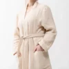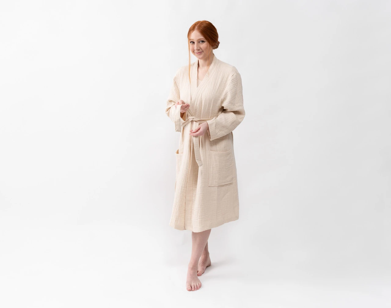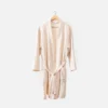 Lounge in lightweight luxury with our Muslin Gauze Bathrobe in Natural. This light beige robe is made from a 100% cotton muslin gauze fabric, giving it a breezy and breathable drape that feels wonderfully soft over your skin. Complete with deep pockets and a matching belt, this classic robe is an absolute dream for at-home comfort during cool spring nights and warm summer mornings.